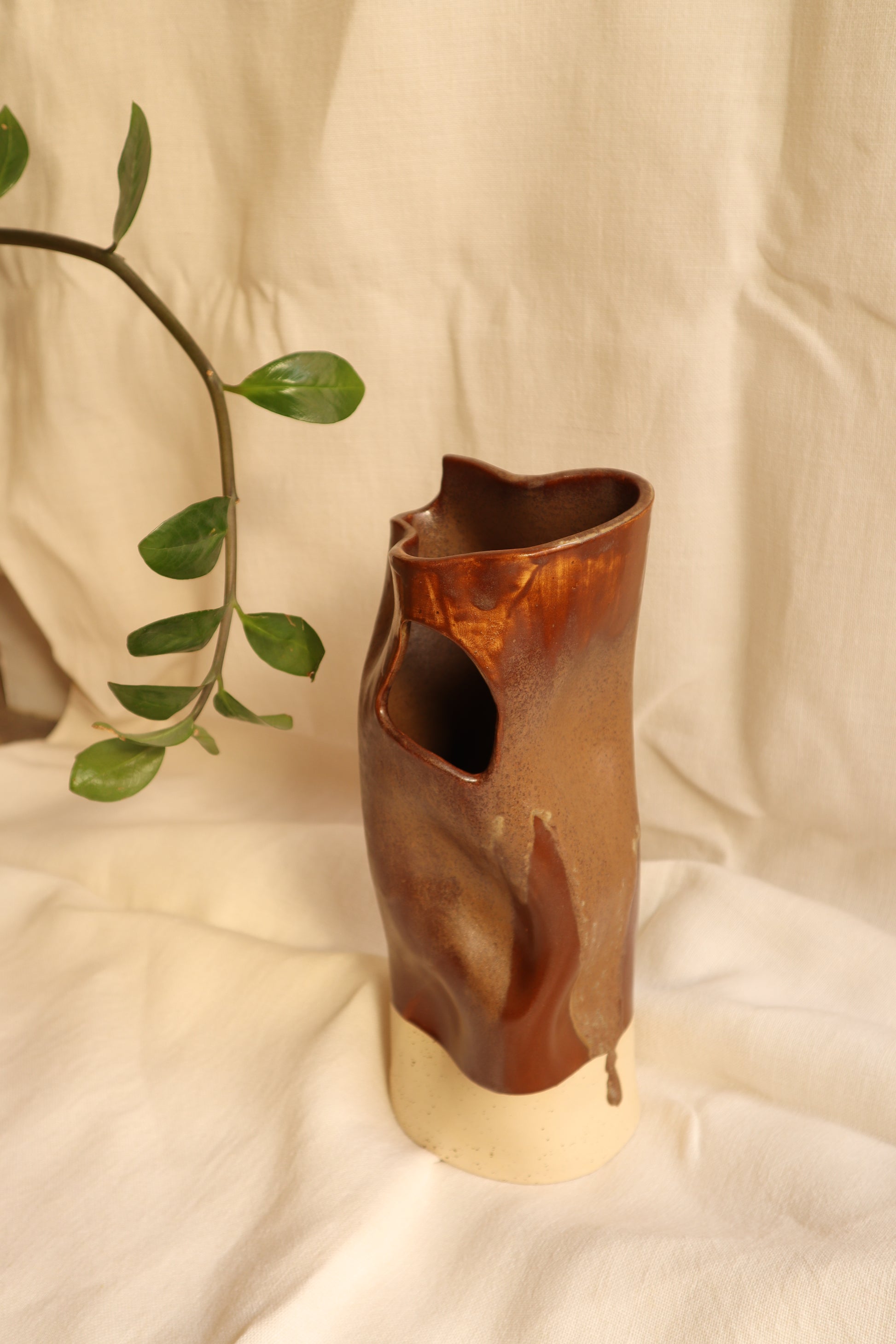 It combines a brown glazed surface with an unglazed area in natural clay, creating a contrast of textures and tones. The interior is fully glazed, making it suitable for fresh flowers and water.
